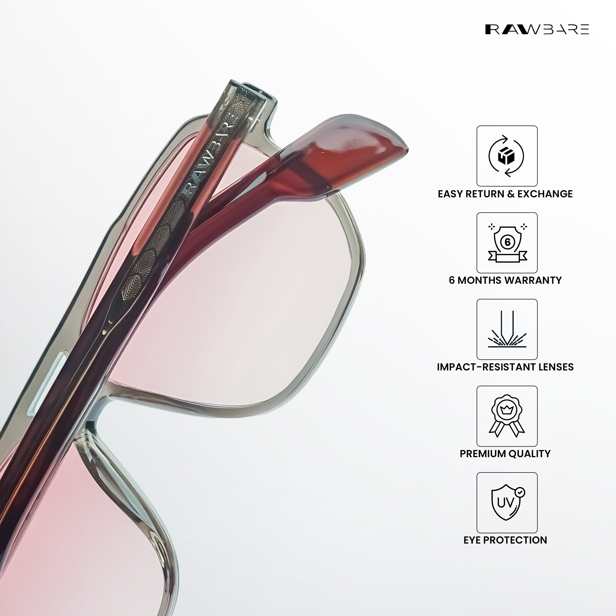 At Rawbare, every pair is crafted with precision and care to meet the highest standards. Our 6-month warranty reflects our commitment to quality and your trust in us. While we stand firmly behind our products, we believe true assurance comes from experiencing eyewear that is built to last. Thank you for choosing Rawbare—where style meets reliability.
