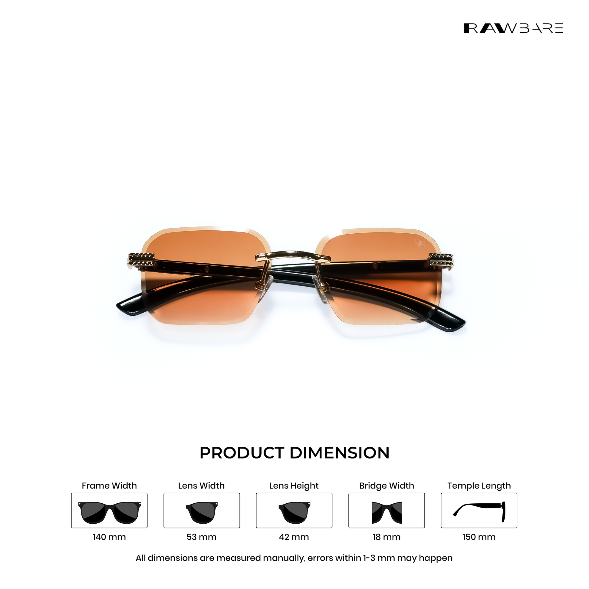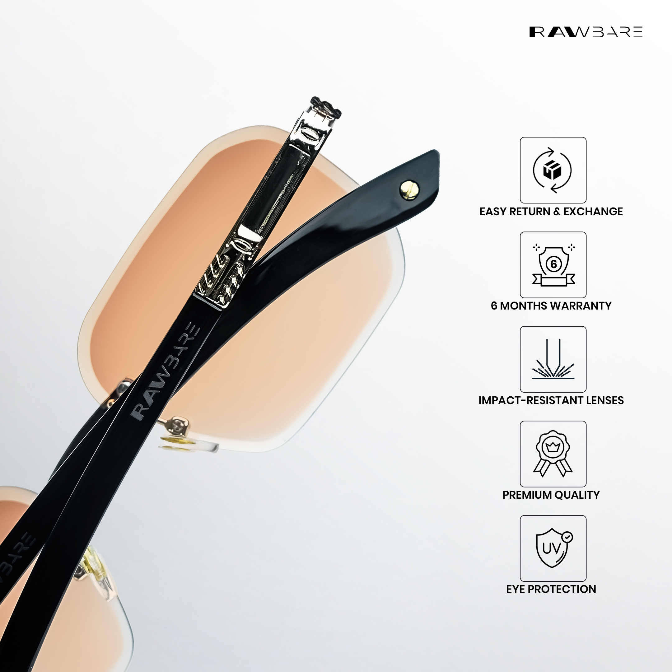 Rawbare Essent Brown Gleam rimless rectangle sunglasses feature a lightweight metal build, UV400 lenses, and a sharp rimless rectangular design crafted for glare-free vision and all-day comfort.