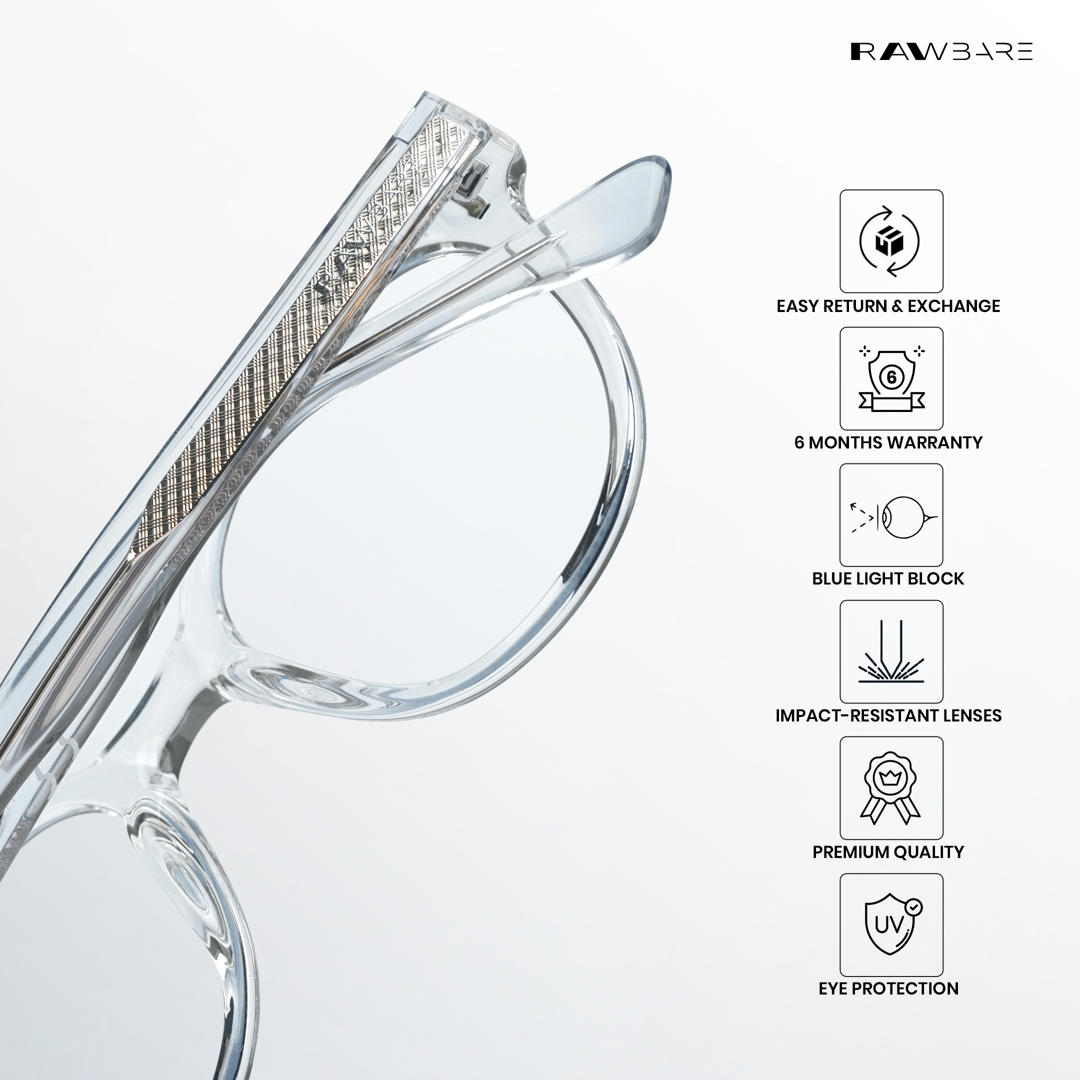 At Rawbare, every pair is crafted with precision and care to meet the highest standards. Our 6-month warranty reflects our commitment to quality and your trust in us. While we stand firmly behind our products, we believe true assurance comes from experiencing eyewear that is built to last. Thank you for choosing Rawbare—where style meets reliability.