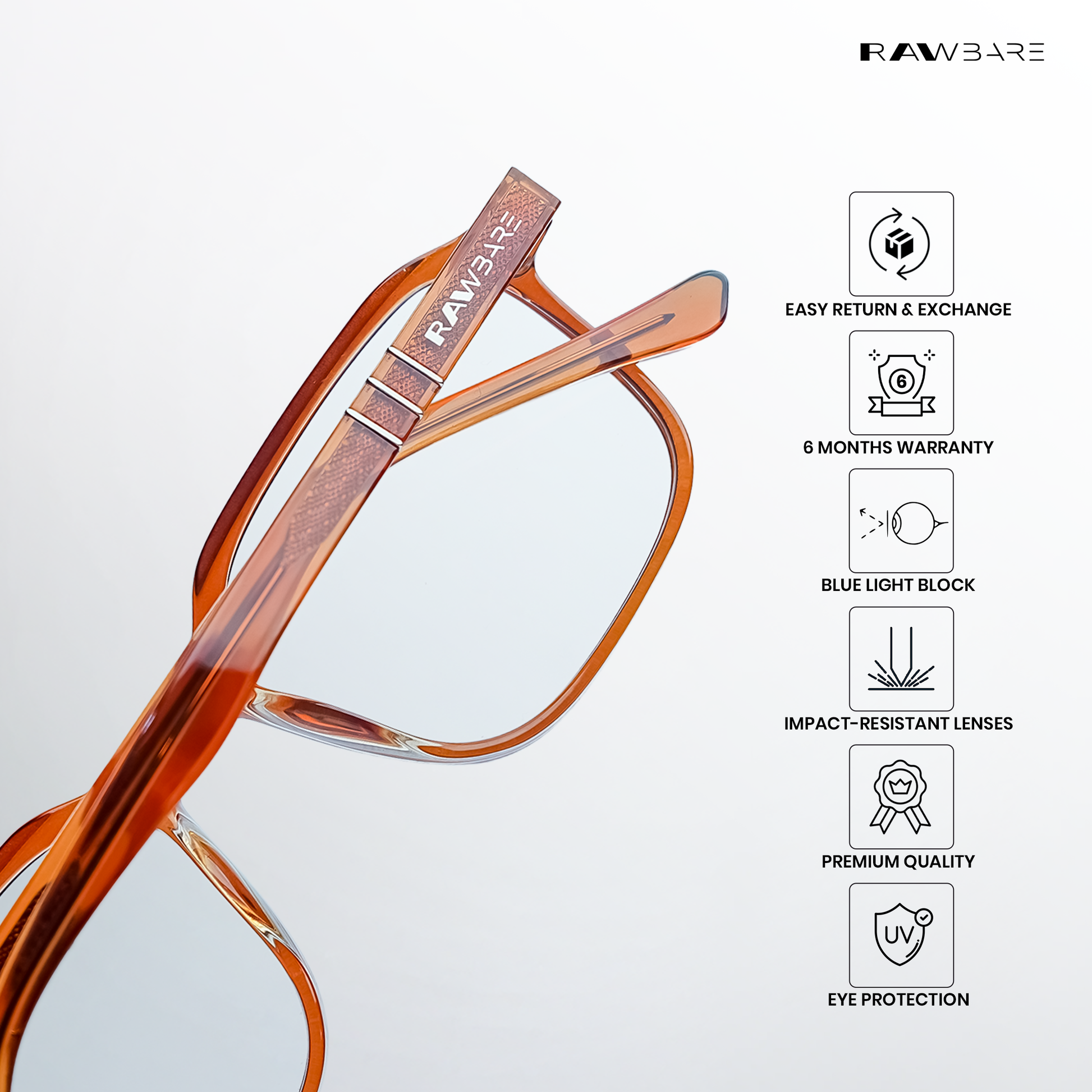 At Rawbare, every pair is crafted with precision and care to meet the highest standards. Our 6-month warranty reflects our commitment to quality and your trust in us. While we stand firmly behind our products, we believe true assurance comes from experiencing eyewear that is built to last. Thank you for choosing Rawbare—where style meets reliability.