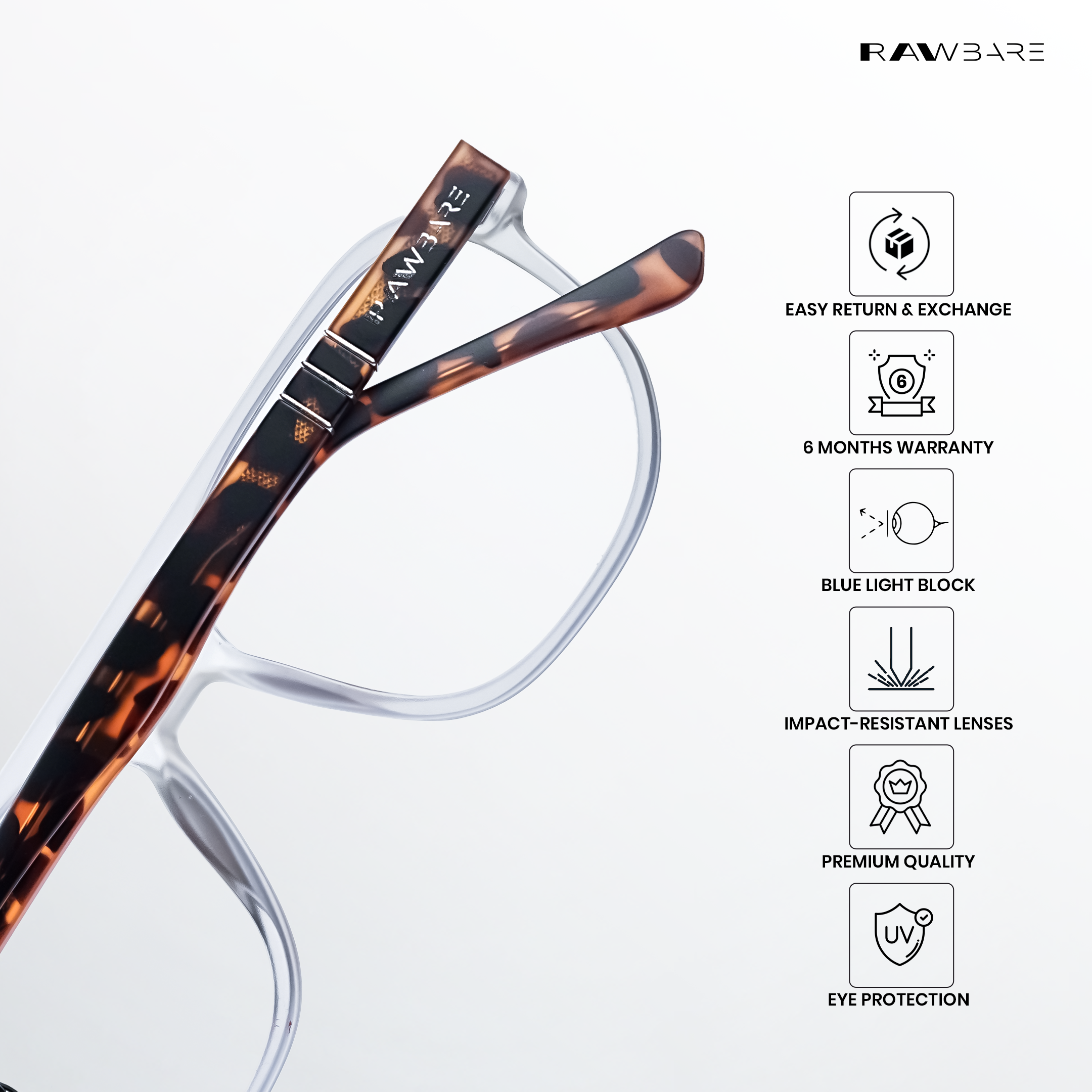 At Rawbare, every pair is crafted with precision and care to meet the highest standards. Our 6-month warranty reflects our commitment to quality and your trust in us. While we stand firmly behind our products, we believe true assurance comes from experiencing eyewear that is built to last. Thank you for choosing Rawbare—where style meets reliability.
