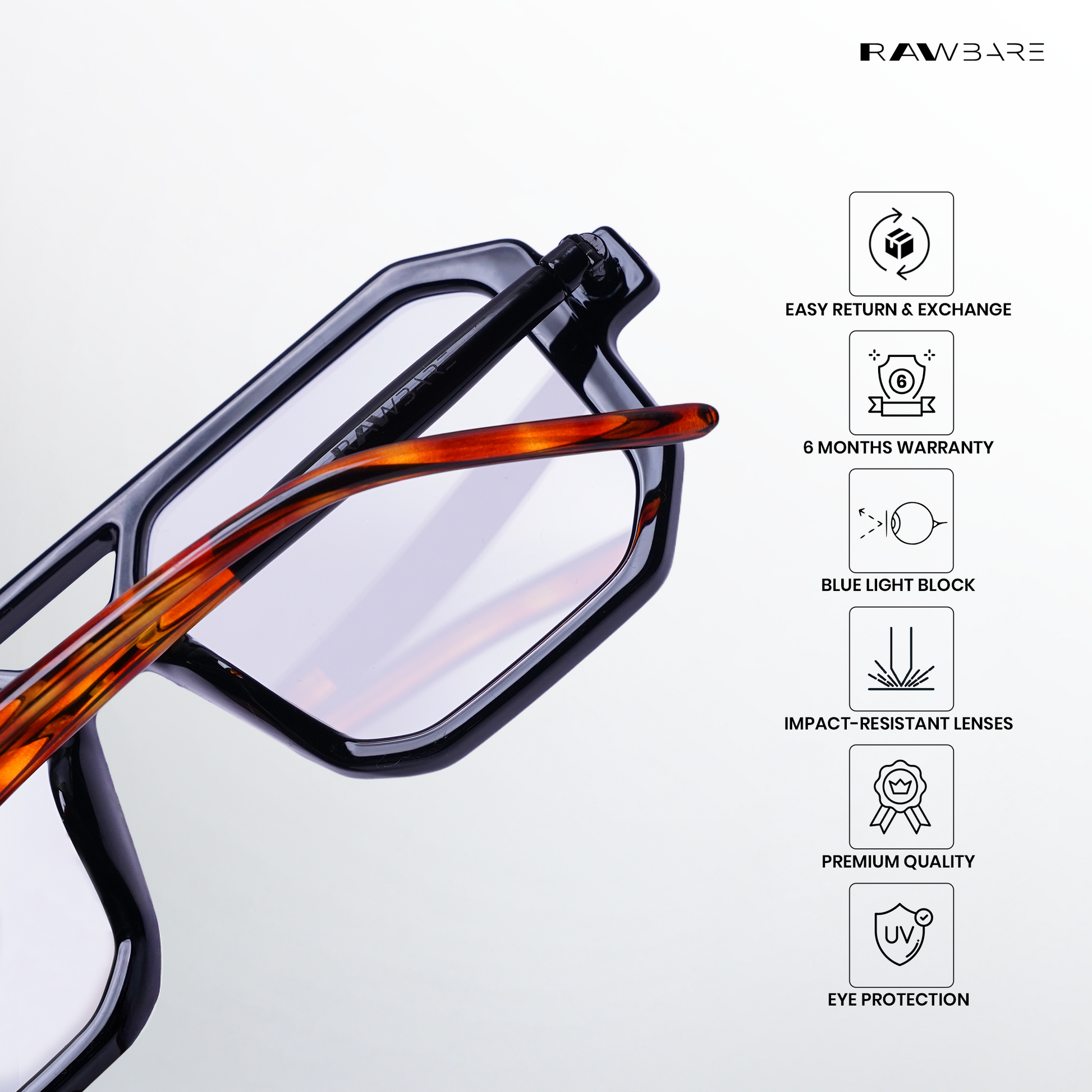 At Rawbare, every pair is crafted with precision and care to meet the highest standards. Our 6-month warranty reflects our commitment to quality and your trust in us. While we stand firmly behind our products, we believe true assurance comes from experiencing eyewear that is built to last. Thank you for choosing Rawbare—where style meets reliability.