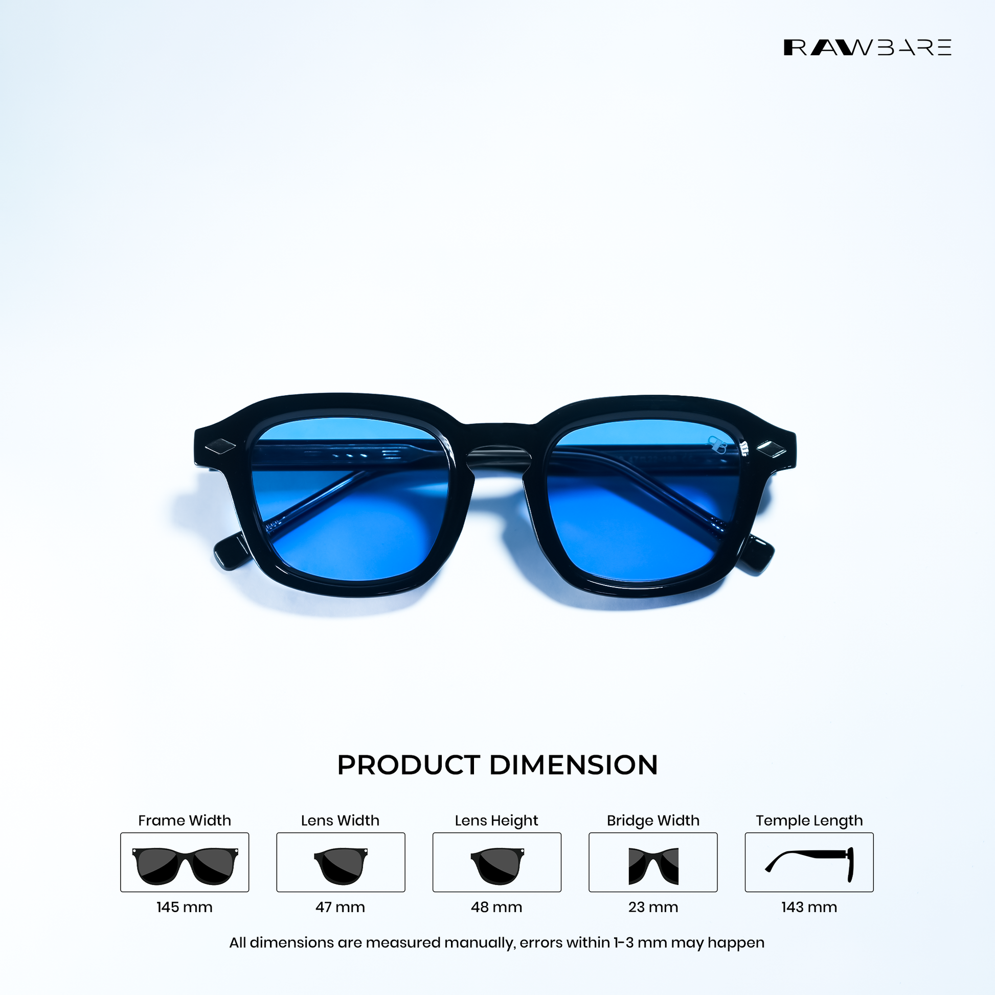 Rawbare Vortex Shades Blue Black square sunglasses feature a lightweight frame, UV400 lenses, and a bold square design built for all-day comfort and glare-free everyday style.