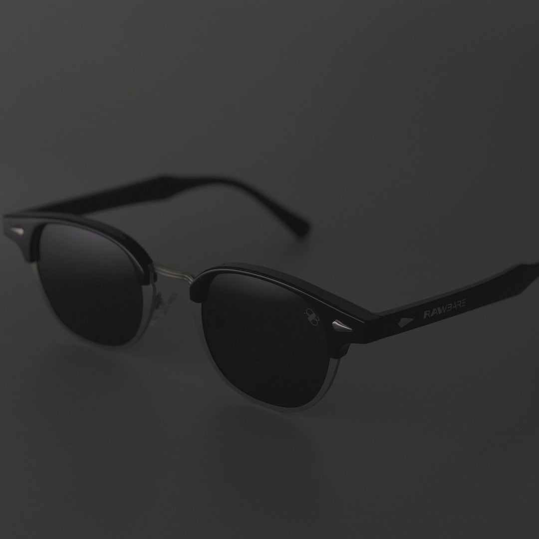 Rawbare Lucknow Lush Shadow Silver Clubmaster half-rim sunglasses feature a lightweight frame, Polarized UV400 protected lenses, and a bold half-rim design built for clear vision and all-day comfort.