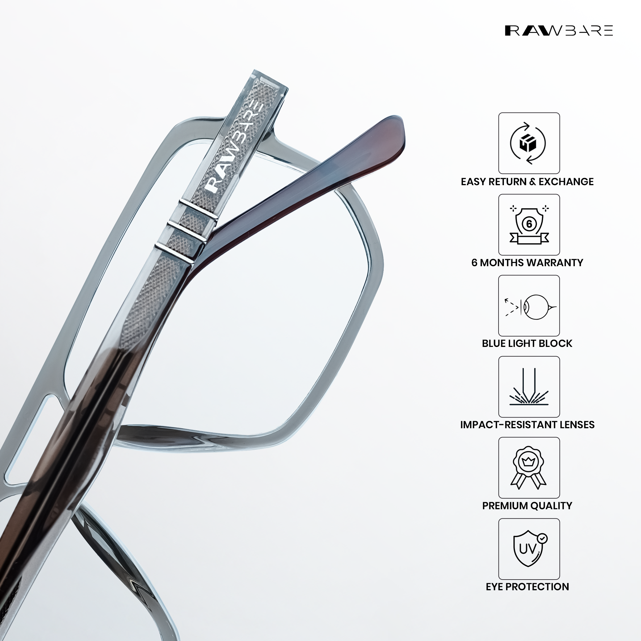Rawbare Arvon Dark Grey square blue-cut eyewear features a lightweight frame, blue light blocking lenses, and a clean square design built for screen comfort and all-day wear.