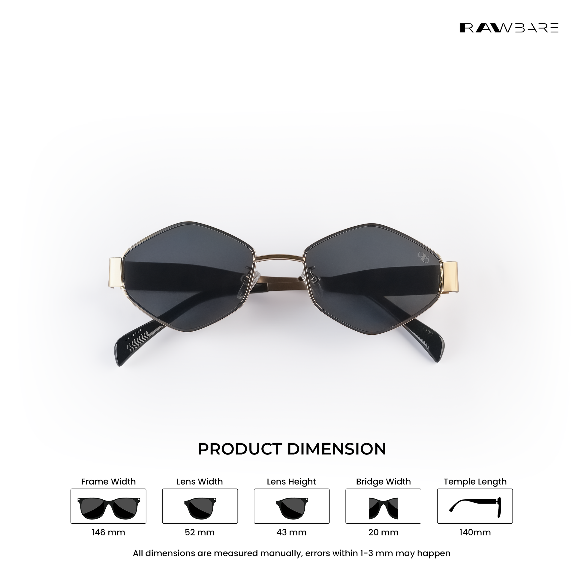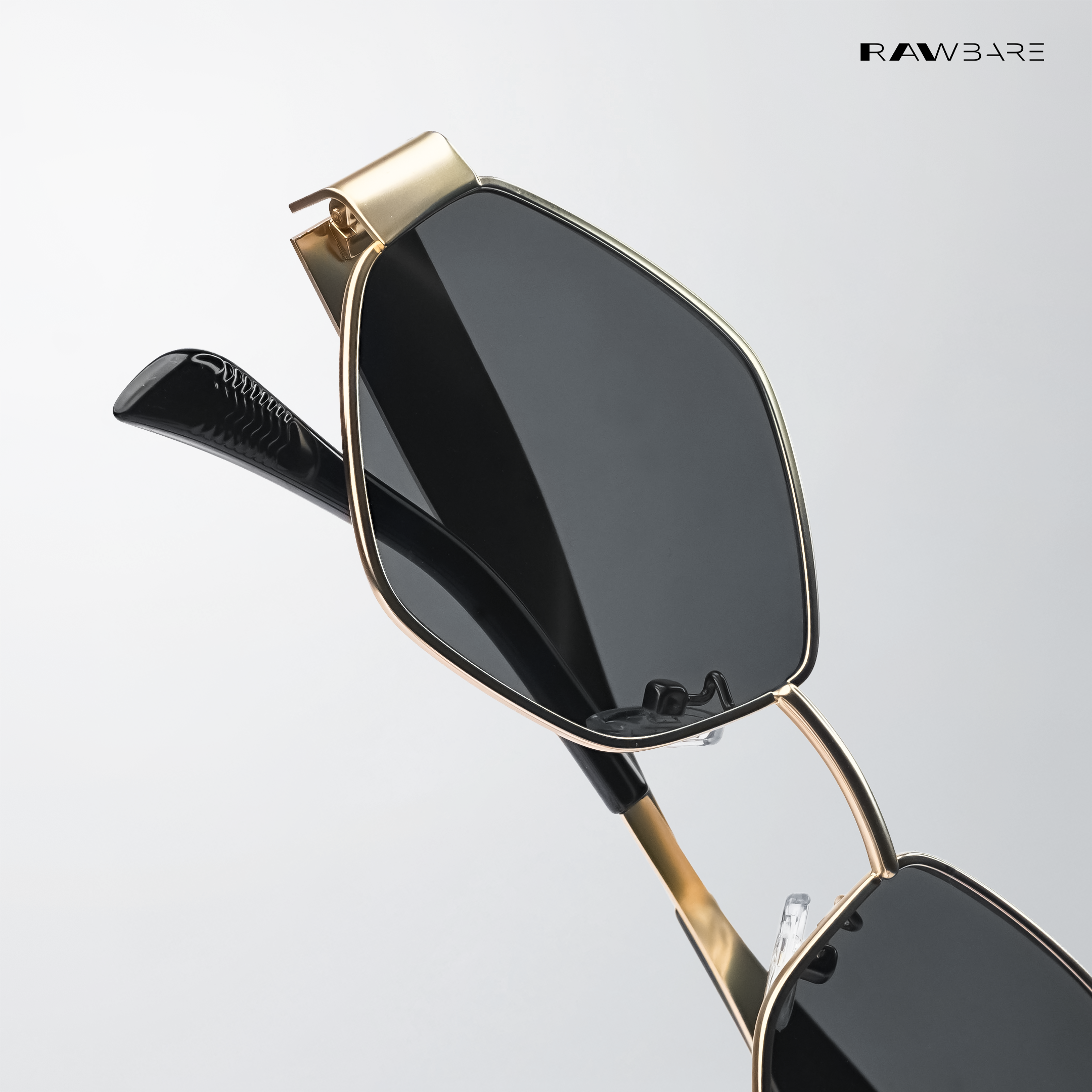 Rawbare Astral Edge Black Gold hexagon sunglasses feature a lightweight metal frame, polarized UV400 lenses, and a sharp geometric design built for all-day comfort and bold everyday wear.