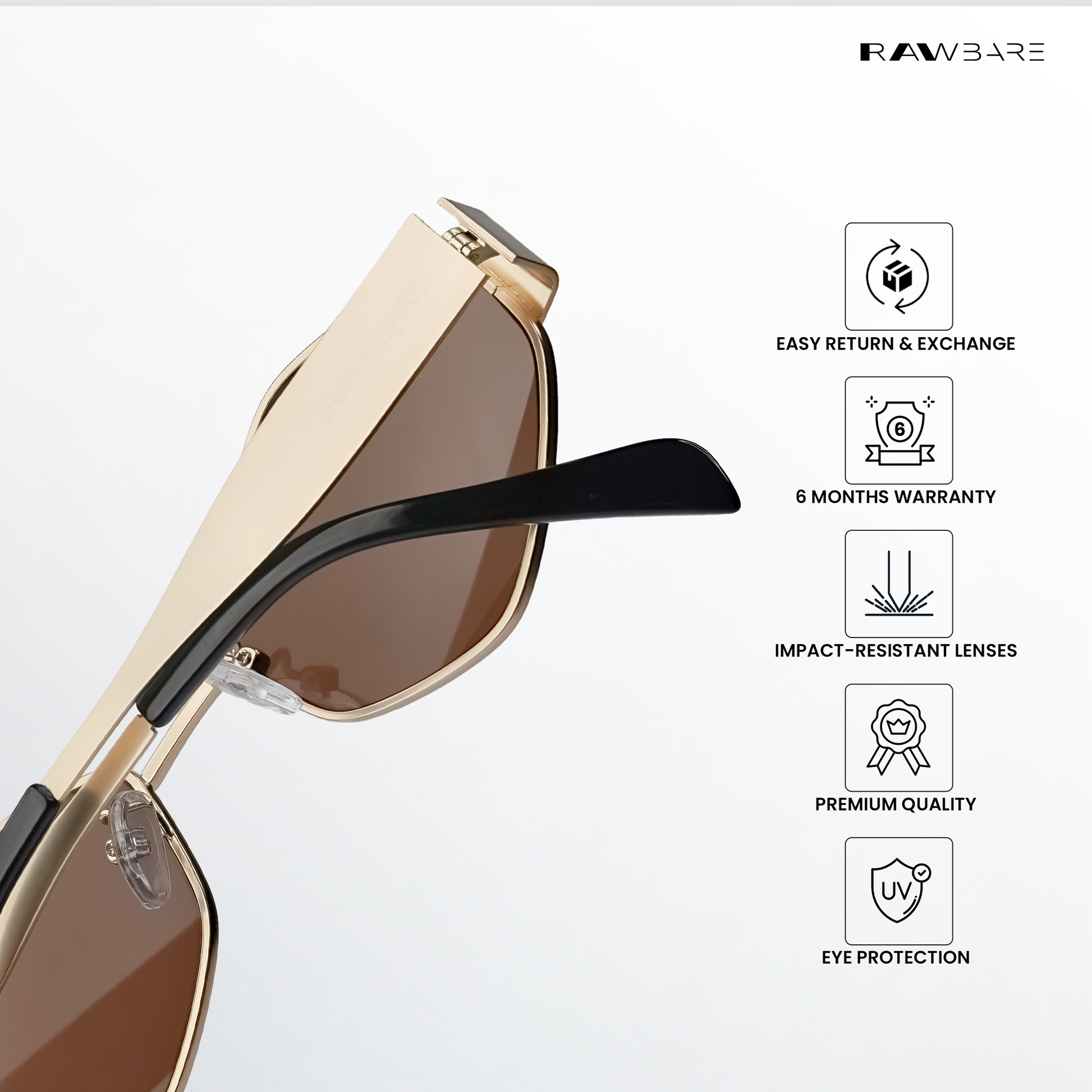Rawbare Astral Edge Brown Gold hexagon sunglasses feature a lightweight metal frame, polarized UV400 lenses, and a sharp geometric design built for all-day comfort and bold everyday wear.