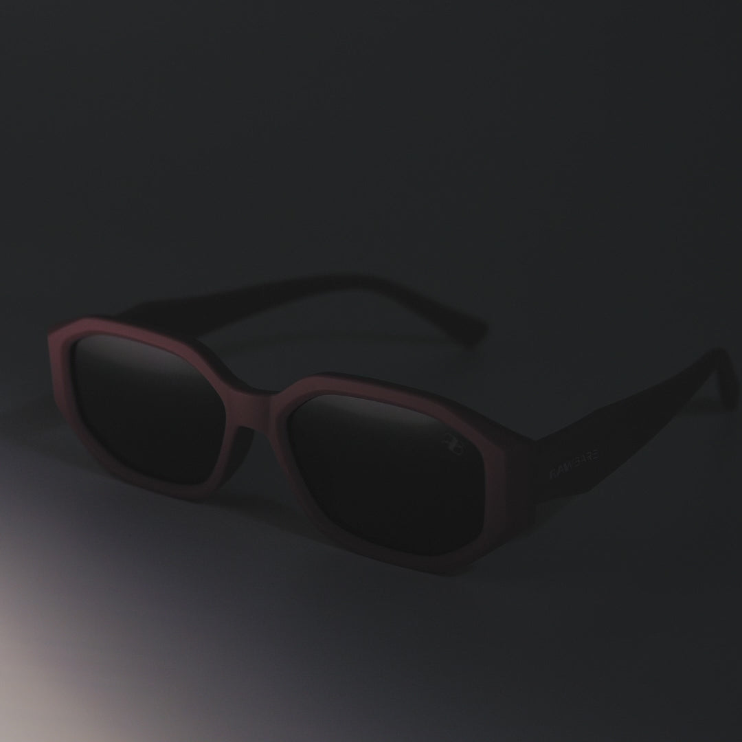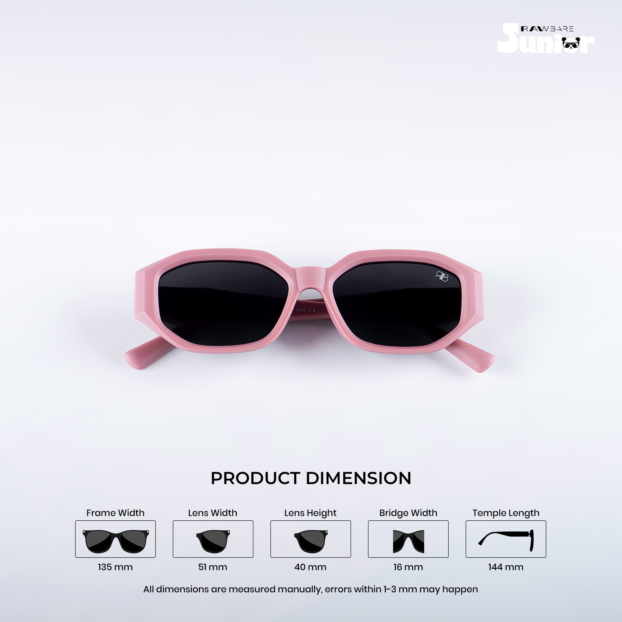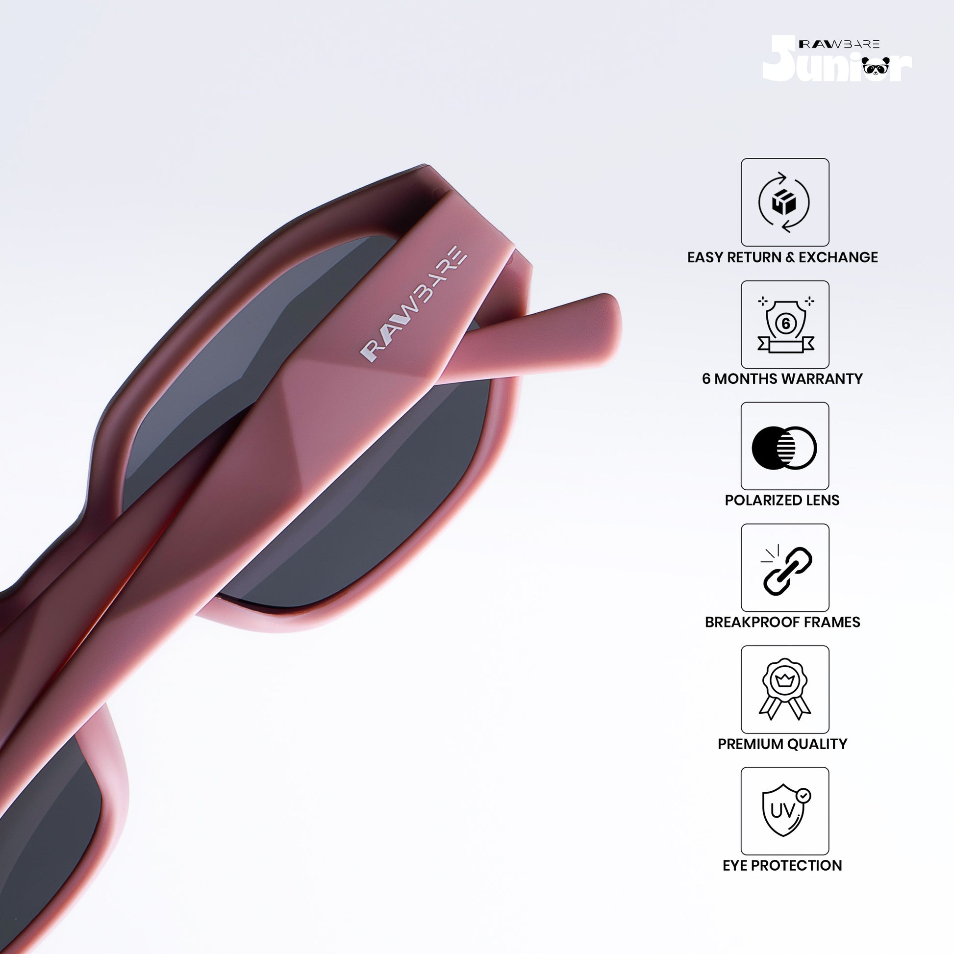 Rawbare Candy Dash Pink Swirl irregular rectangle kids’ sunglasses feature a playful berry-toned frame in a trendy irregular rectangle shape, polarized UV400 lenses for full sun protection and glare reduction, and a lightweight, durable design made for fun, comfortable all-day wear.