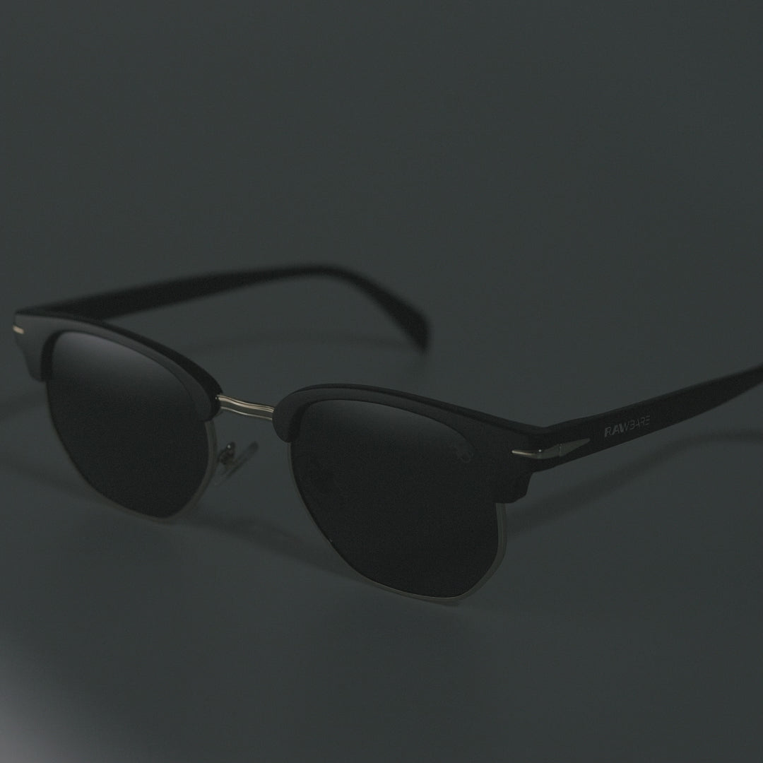 Rawbare Delhi Daze Matte Black Clubmaster half-rim sunglasses feature a lightweight frame, UV400 protected lenses, and a bold half-rim design built for clear vision and all-day comfort.
