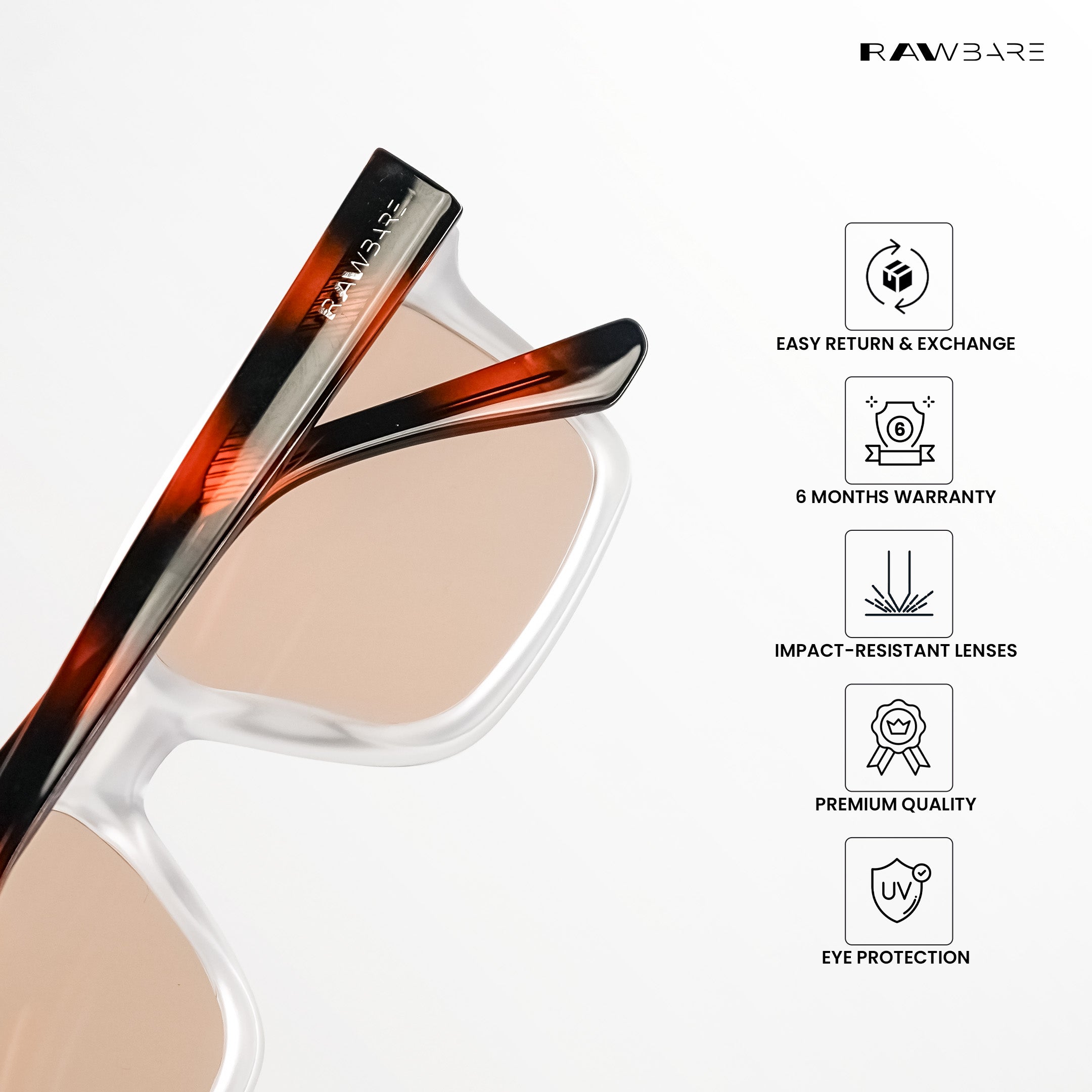 The Srinagar Noir – Crystal Brown Square Sunglasses by rawbare, part of our luxe collection, offer a clean, polished look with warm undertones. Designed with a sleek square frame and crystal brown finish, this pair reflects effortless sophistication. Perfect for versatile styling, it delivers clarity, comfort, and a modern edge.