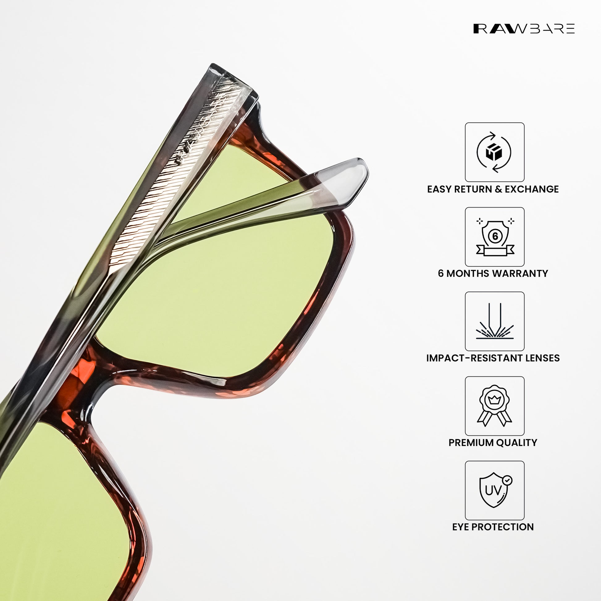 At Rawbare, every pair is crafted with precision and care to meet the highest standards. Our 6-month warranty reflects our commitment to quality and your trust in us. While we stand firmly behind our products, we believe true assurance comes from experiencing eyewear that is built to last. Thank you for choosing Rawbare—where style meets reliability.